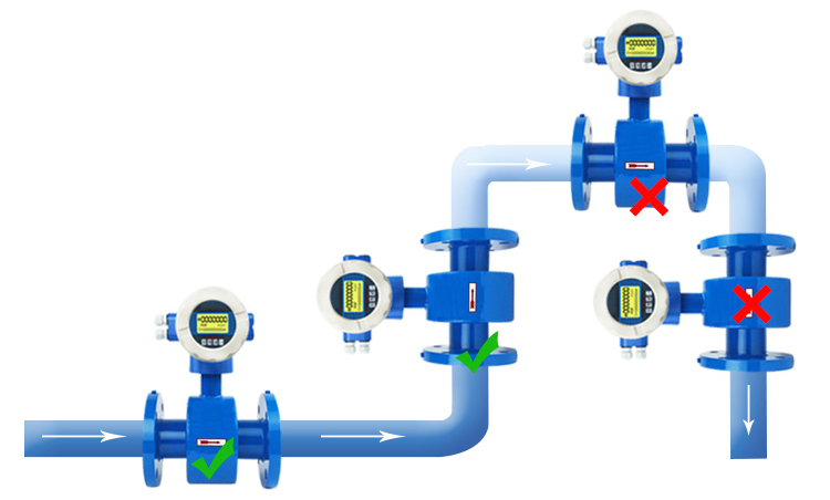 | 1.フローメーターの前には、少なくとも5*d(dはフローメーターの内径)ストレートパイプセクションとその背後に3*dストレートパイプセクションである必要があります。 | 2.パイプラインの上昇部分にインストールする必要があります | 3.水平パイプの下部にインストールし、垂直方向に上向きに、パイプの最高点で垂直に下向きに取り付けないようにします。 | 4.開いた排出パイプに設置すると、パイプの下部に設置する必要があります。 |
